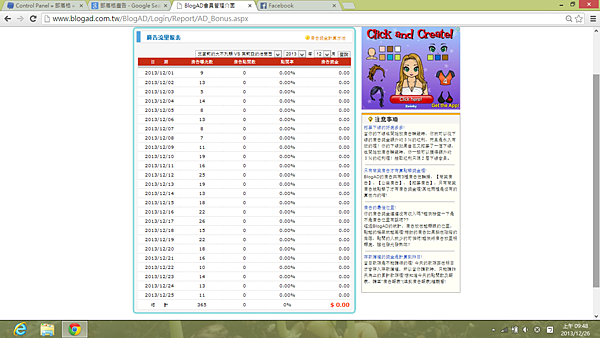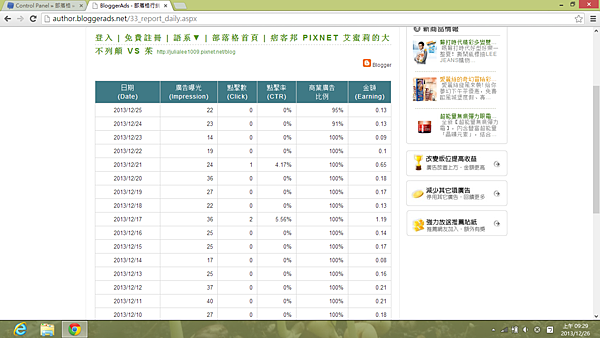 只有當有讀者點擊廣告的時候才會有比較多的收入,像是12/21和12/17,就有0.65和1.19的收入
