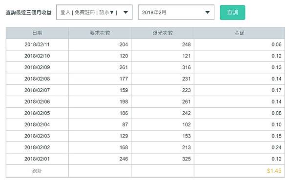 從2013年8月到2018年2月 總共55個月 總收入247元 平均一個月4.49元orz (我們每天的人氣大概100左右)