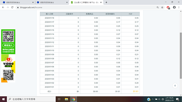 2020年一月份的收益報告如下(一月份每日部落格流量約100人次上下):